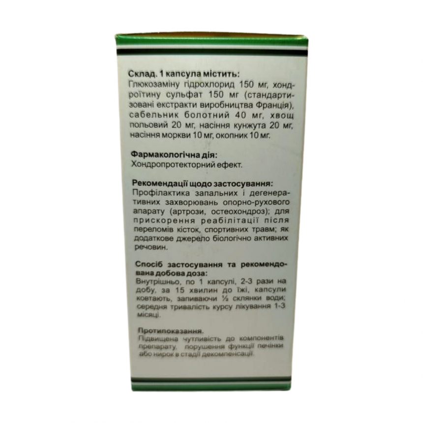 Склад: глюкозаміну сульфат, хондроїтину сульфат, шабельник, хвощ польовий, насіння кунжуту, насіння моркви, живокіст (живокіст).