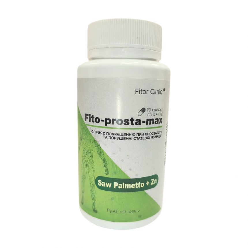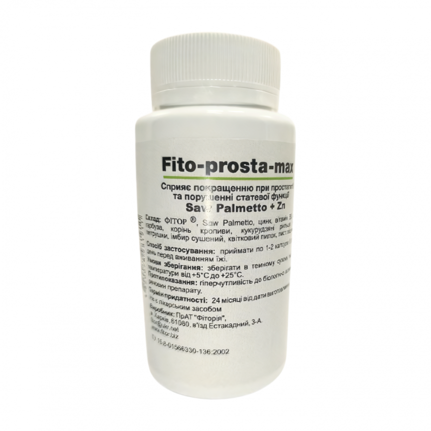 Fito-prosta-max – це природний продукт, який був створений спеціально для підтримки чоловічого здоров'я. Фітокомплекс допомагає в боротьбі з хронічним простатитом, аденомою передміхурової залози, порушеннями функцій передміхурової залози, а також з ускладненнями після операцій на передміхуровій залозі. Він також допомагає позбутися проблем з сечовипусканням, рекомендований при інтерорецептивно-копулятивній дисфункції та чоловічому безплідді.