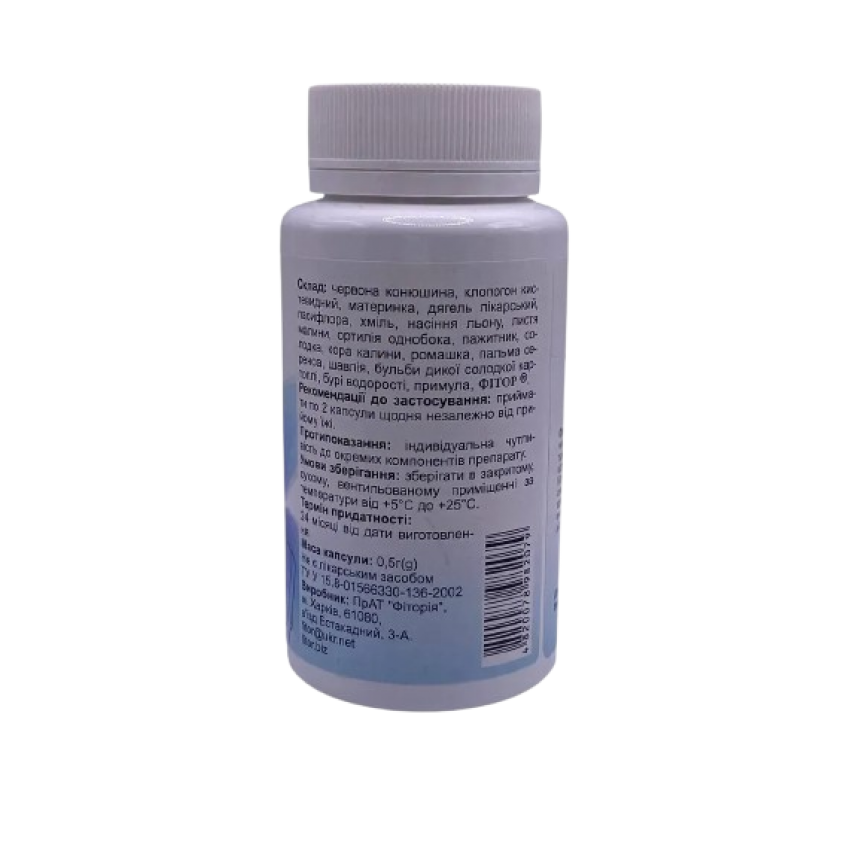 Склад: червона конюшина, клопогон кистевидний, материнка, дягель лікарський, пасифлора, хміль, насіння льону, листя малини, ортилія однобока, пажитник, солодка, кора калини, ромашка, пальма сереноа, шавлія, бульби дикої солодкої картоплі, бурі водорості, примула, ФІТОР ®.