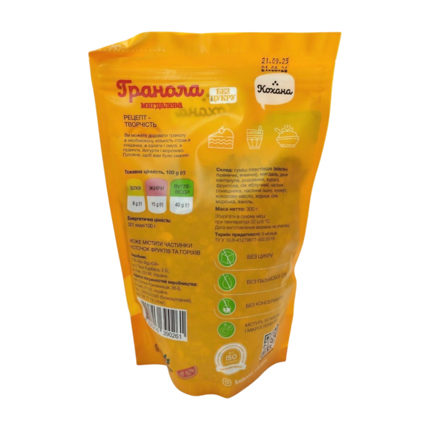Гранола «Мигдальна» ТМ «Кохана» – поживна суміш з пластівців вищого ґатунку, горіхів, меду та сухофруктів, запечених до хрусткого стану. В міру солодка і з дуже приємним ароматом. При цьому не містить цукру, барвників, пальмової олії та консервантів.