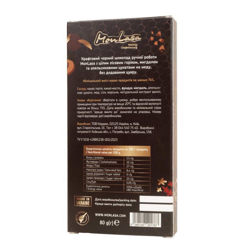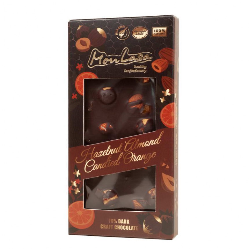 Чорний крафтовий шоколад з лісовими горіхами, мигдалем та апельсиновими цукатами на меду ТМ MonLasa – шоколад ручної роботи, при виготовленні якого використовувалися лише натуральні інгредієнти найвищої якості.