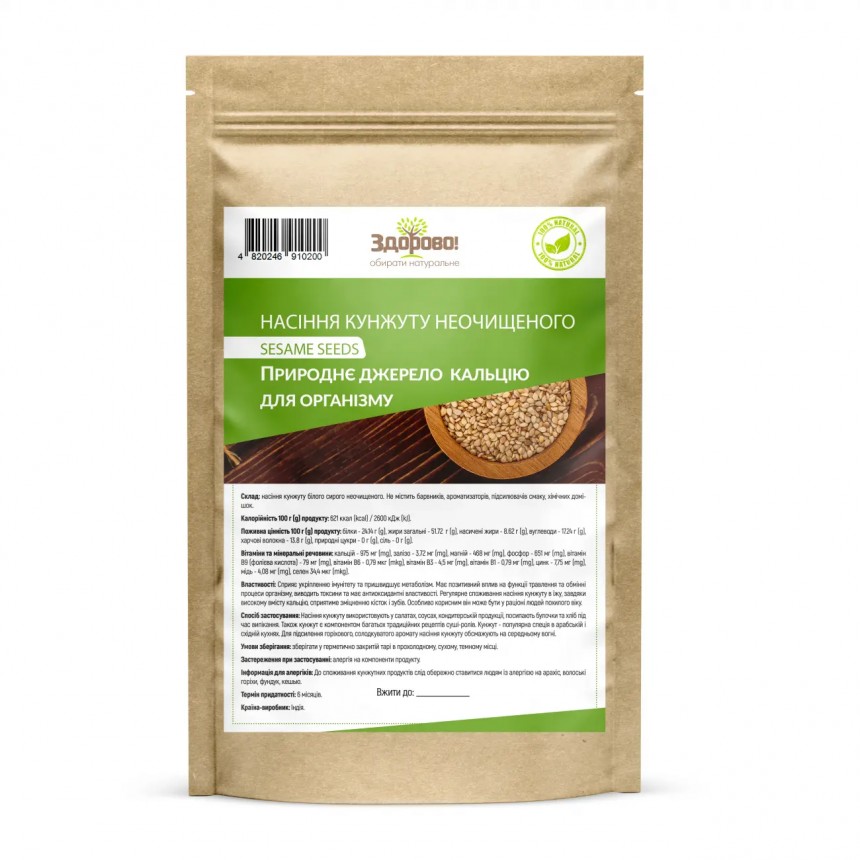 Кунжут білий неочищений Здорово — це натуральне насіння з насиченим комплексом корисних речовин і приємним м’яким горіховим смаком. Продукт відомий своїми цілющими властивостями й активно використовується в кулінарії та народній медицині.