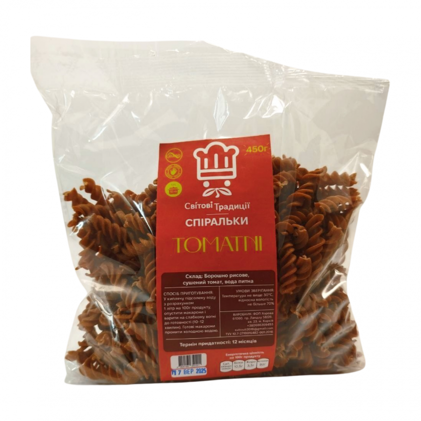Макарони-спіральки рисові томатні ТМ «Світові традиції» виготовляються за спеціальним рецептом з рисового борошна, яке завжди цінували в Японії та інших країнах Сходу. Річ у тому, що рисове борошно не містить глютену, який є дуже сильним подразником органів травного тракту, а також причиною алергії та порушень обміну речовин. Макарони «Світові традиції» сподобаються всім прихильникам здорового харчування та підійдуть веганам, адже вони не містять яєць, лактози, консервантів та синтетичних барвників.