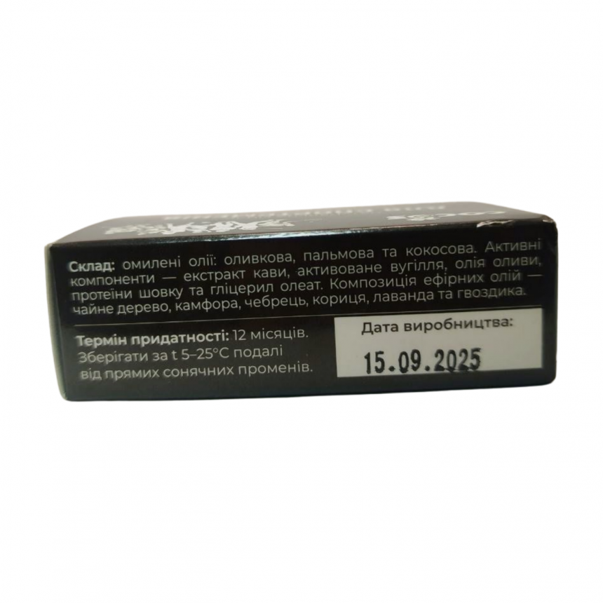 Склад: омилені олії: оливкова, пальмова та кокосова. Активні компоненти — екстракт кави, активоване вугілля, олія оливи, протеїни шовку та гліцерил олеат. Композиція ефірних олій — чайне дерево, камфора, чебрець, кориця, лаванда та гвоздика, косметичний пігмент.