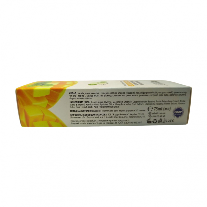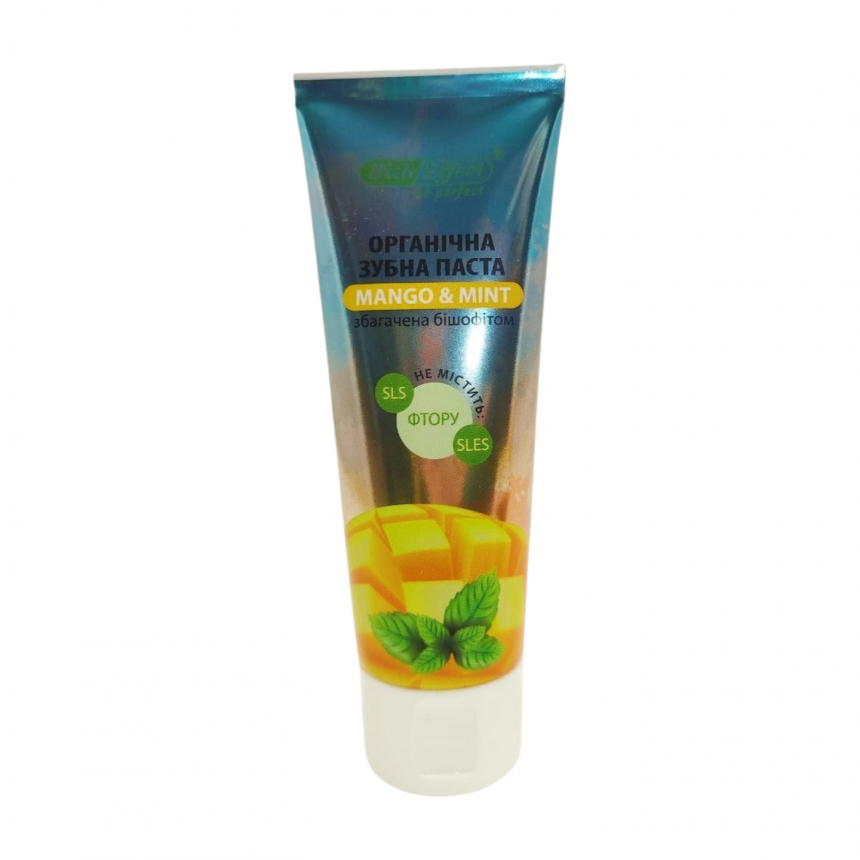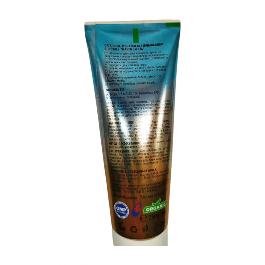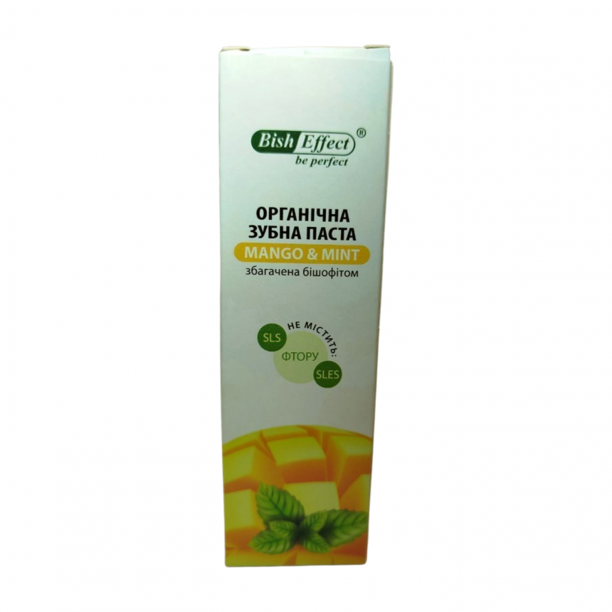 Органічна зубна паста з бішофітом BishEffect Манго і М’ята — це натуральний догляд із тропічним ароматом, створений для щоденного очищення та зміцнення зубів усієї родини.