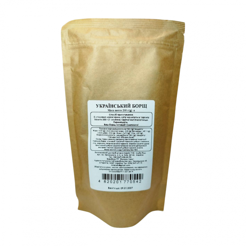 Формат «экспресс-обед» оценят туристы, спортсмены, студенты, веганы и все, кто придерживается диеты. Борщ в упаковке 200 г – это полноценный обед на семью или небольшую компанию. 1 упаковка = 4 порций борща. 1 порция = 300 граммов готового к употреблению горячего борща. Насыпьте 5 столовых ложек в тарелку, добавьте 250 г (1 стакан) горячей воды, размешайте и ваш питательный обед готов!