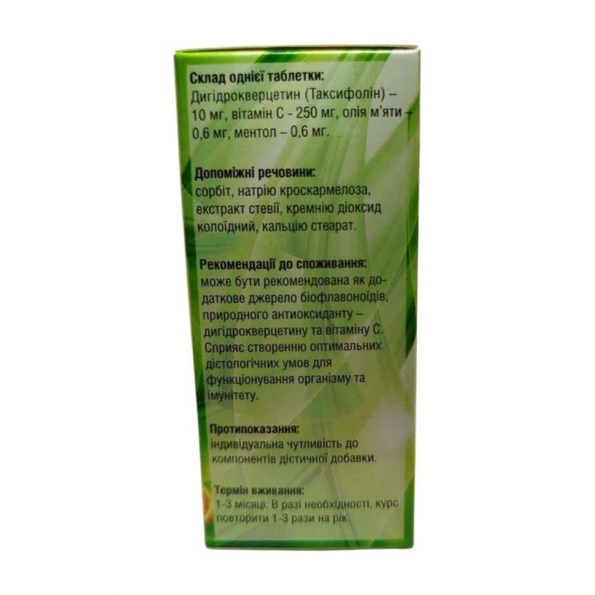 Состав: дигидрокверцетин (Таксифолин) - 10 мг, витамин С - 250 мг, масло мяты - 0,6 мг, ментол- 0,6 мг, экстракт стевии, сорбит, кроскармеллоза натрия, диоксид кремния коллоидный, стеарат кальция.