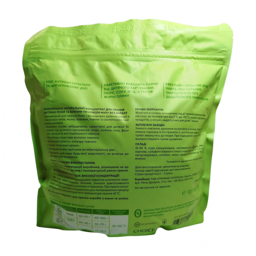Эко порошок Green Max состоит из натуральных компонентов, которые снижают вероятность возникновения аллергической реакции у ребенка до минимума. Подходит для глубокой очистки белых и цветных вещей всех видов тканей, кроме шерсти и шелка. Сохраняет яркость цвета даже после нескольких стирок. Благодаря активному кислороду белые вещи остаются белыми, сохраняя структуру ткани.