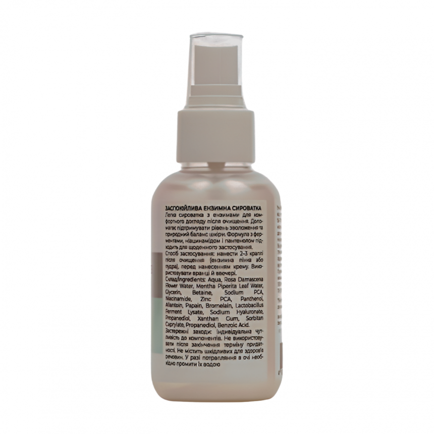 Состав: вода, гидролат цветов дамасской розы, гидролат листьев перечной мяты, глицерин, бетаин, натрий PCA, ниацинамид, цинк PCA, пантенол, аллантоин, папаин, бромелайн, лизат фермента лактобактерий, гиалуронат натрия, пропандиол, бензойная кислота.