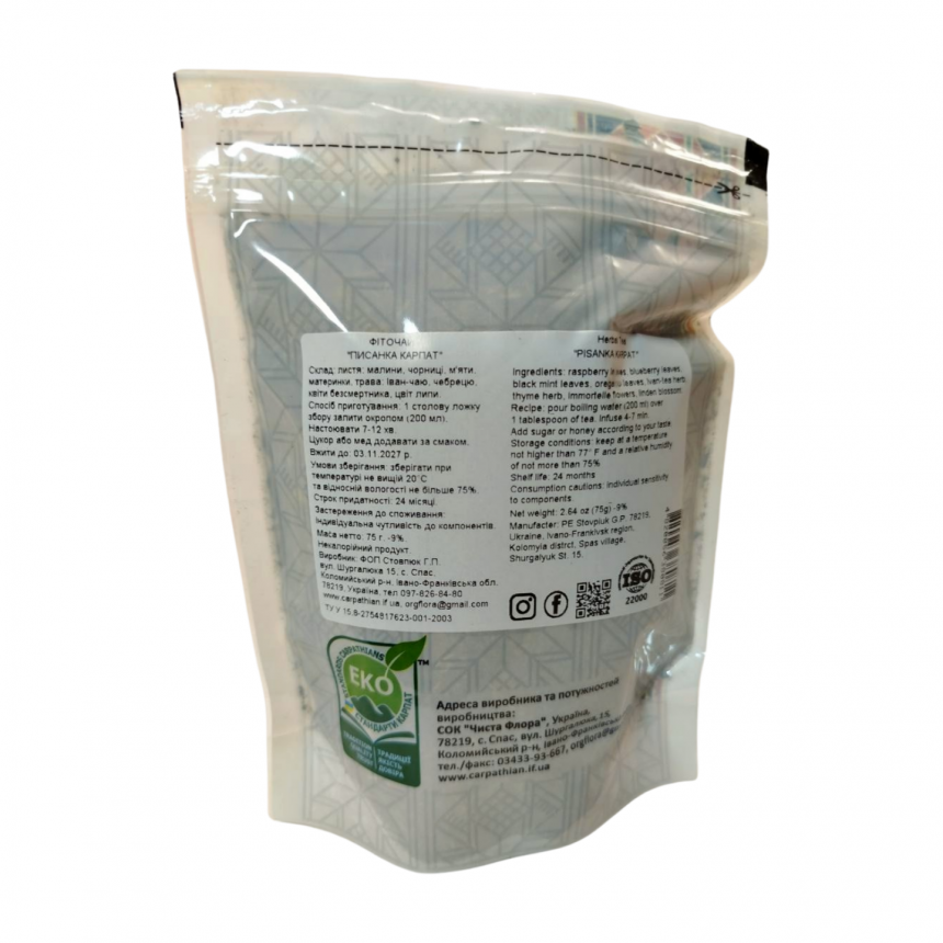Травяной фиточай «Писанковый» создан из ароматных карпатских трав и цветов. Листья малины и черники, мята, душица, иван-чай и чабрец в сочетании с бессмертником и липовым цветом формируют мягкий, освежающий настой. Напиток передаёт ощущение летней прохлады и атмосферу сказочных Карпат.