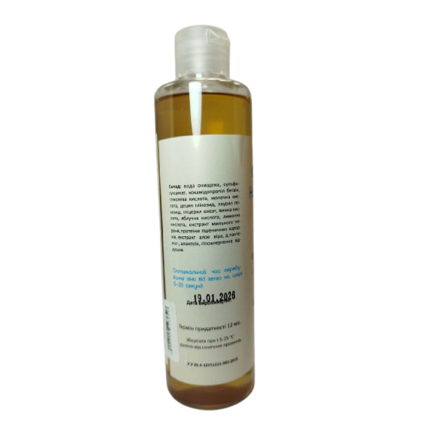 Состав: вода очищенная, сульфосукцинат, кокамидопропилбетаин, гликолевая кислота, молочная кислота, децилглюкозид, лаурилглюкозид, глицерил олеат, винная кислота, яблочная кислота, лимонная кислота, экстракт мыльного корня, протеины зародышей пшеницы, экстракт алоэ вера, D-пантенол, аллантоин, гипоаллергенная отдушка.