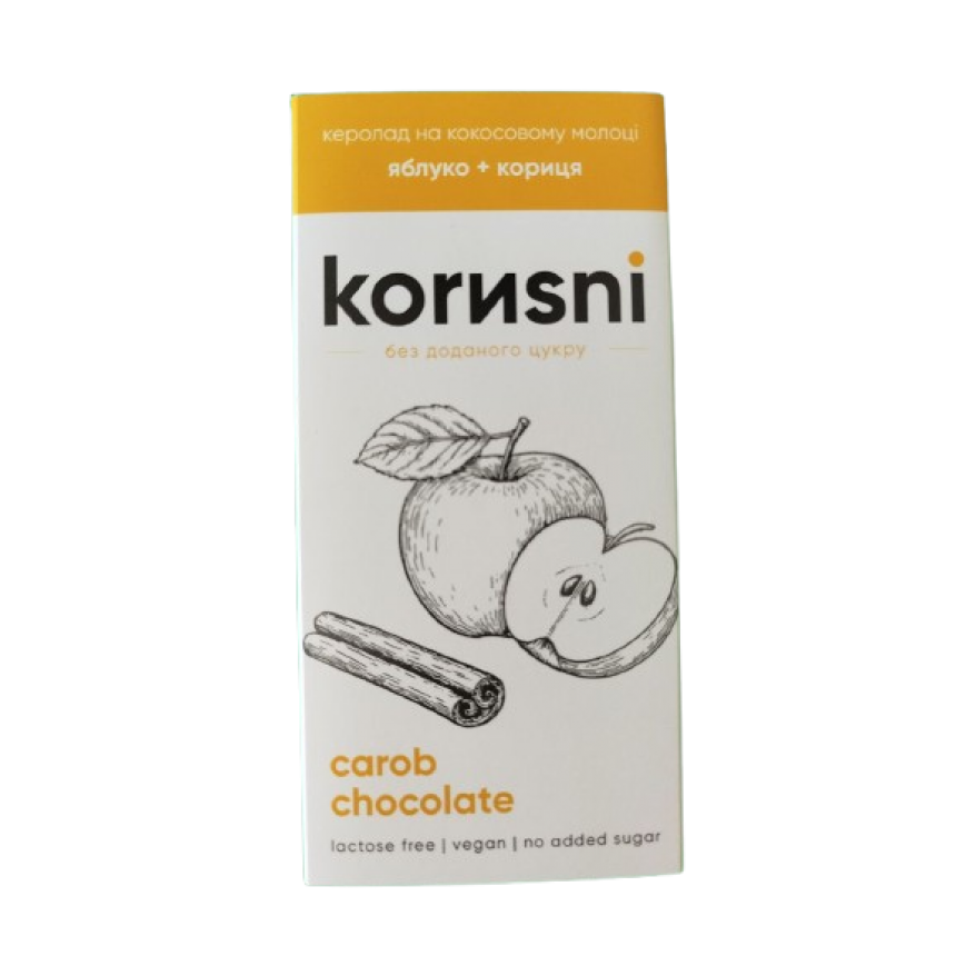 Состав: масло какао, кероб, сухое кокосовое молоко, сублимированное яблоко, корица, натуральный подсластитель – экстракт стевии.