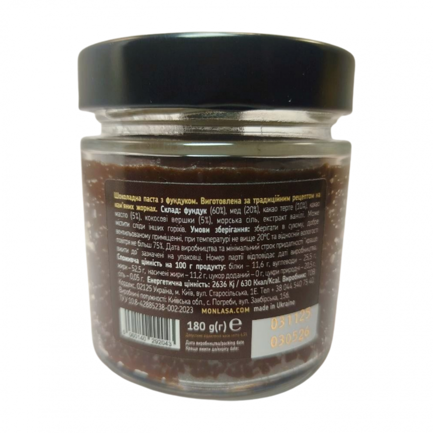 Шоколадная паста из фундука MonLasa — натуральная кремовая намазка, приготовленная по традиционному методу на каменных жерновах. Такая технология помогает сохранить природный аромат орехов и какао, а также получить нежную однородную консистенцию.