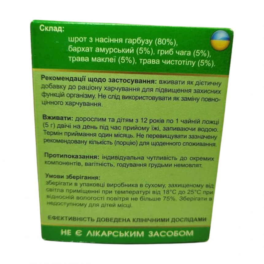 Состав: шрот из семян тыквы (80%), бархат амурский (20%), гриб чага (5%), трава маклея (5%), трава чистотела (5%).
