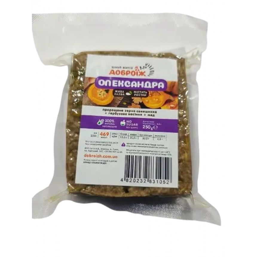 Живая халва Доброїж Олександра без сахара — это натуральный и полезный десерт, созданный из пророщенных семян тыквы, зёрен подсолнечника и натурального мёда. Отлично подходит для тех, кто заботится о своём здоровье и контролирует уровень сахара в рационе.