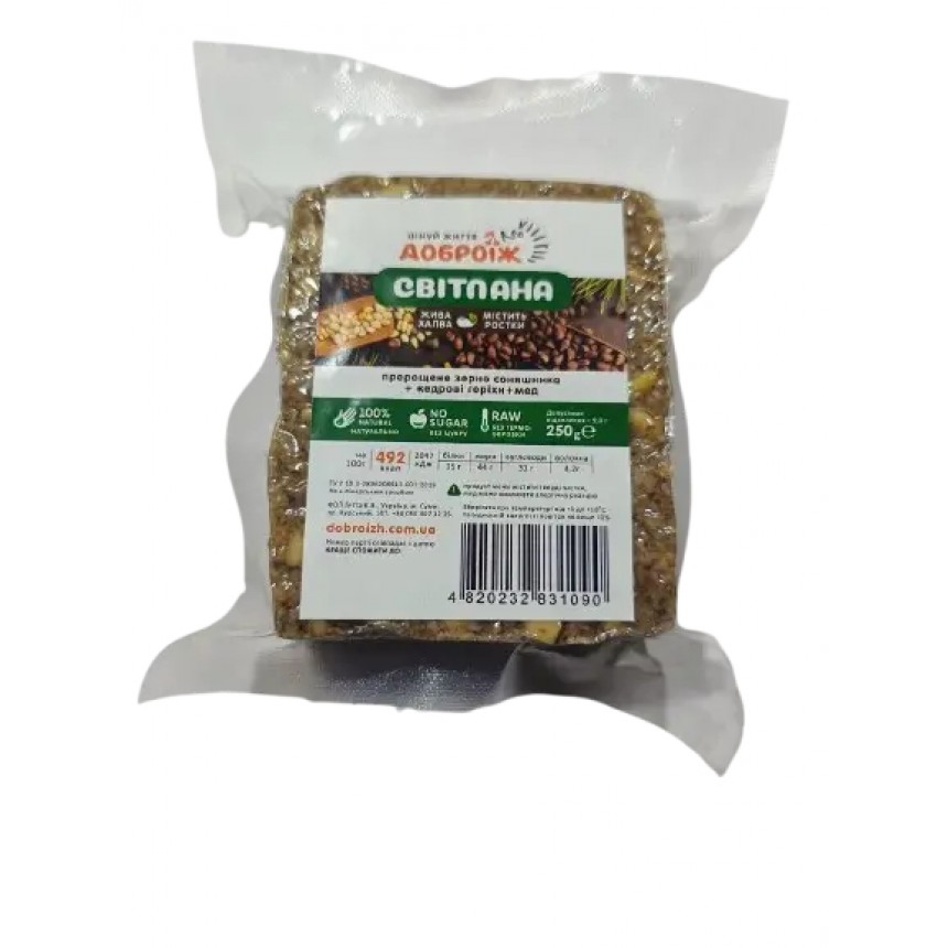 Живая халва Доброїж Светлана без сахара — это натуральный и полезный десерт, созданный на основе кедровых орехов, пророщенного зерна подсолнечника и натурального мёда. Отличный выбор для тех, кто ценит природный состав и заботится о своём здоровье.