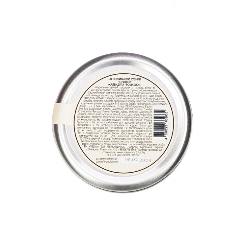 Состав: каолин, морская соль, цитрат магния, пудра цветков календулы, пудра цветков ромашки, ксилитол, ментол, стеарат магния, экстракт стебля бамбука, эфирное масло лаванды, линалоол, лимонен