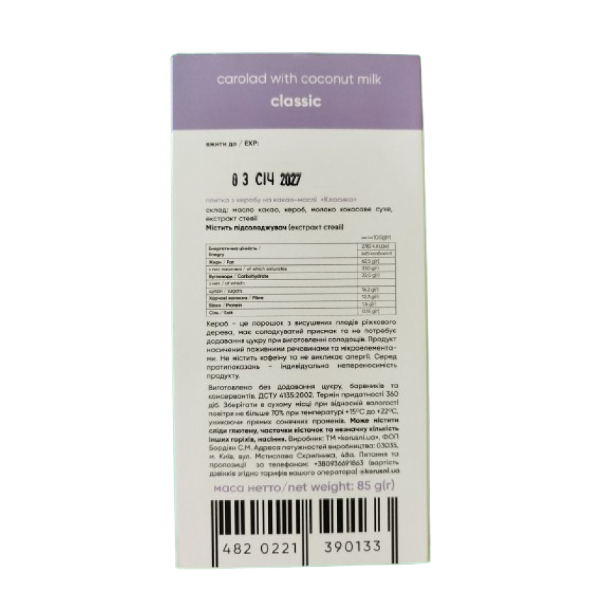 Склад: масло какао, кероб, сухе кокосове молоко, екстракт стевії