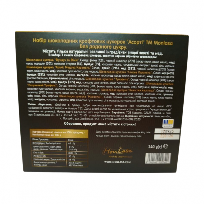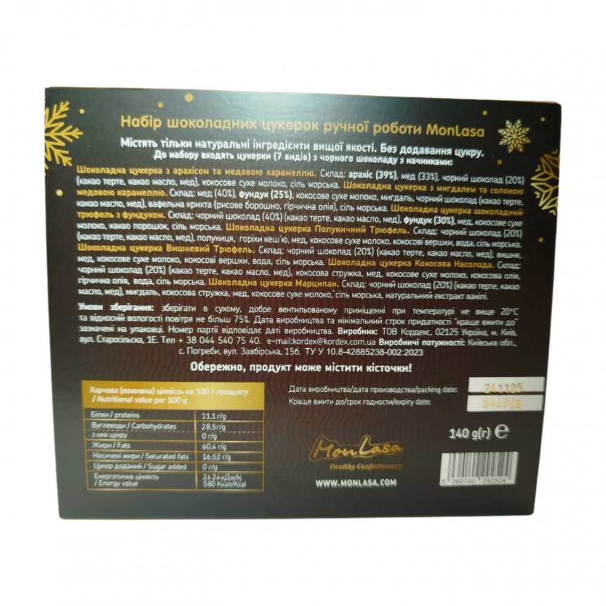 «Асорті» MonLasa – це ідеальний вибір для тих, хто прагне здорового та збалансованого способу життя. Цукерки не містять доданого цукру, штучних ароматизаторів чи консервантів – вони повністю натуральні.