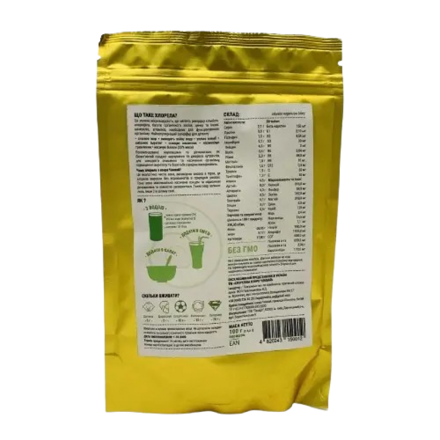 Хлорела – це зелена мікроводорость, що містить багато хлорофілу, органічного заліза, цинку, каротиноїдів та інших корисних речовин. Має детокс ефект, сприяє позбавленню зайвої ваги, зміцнює імунітет, усуває дефіцит заліза.